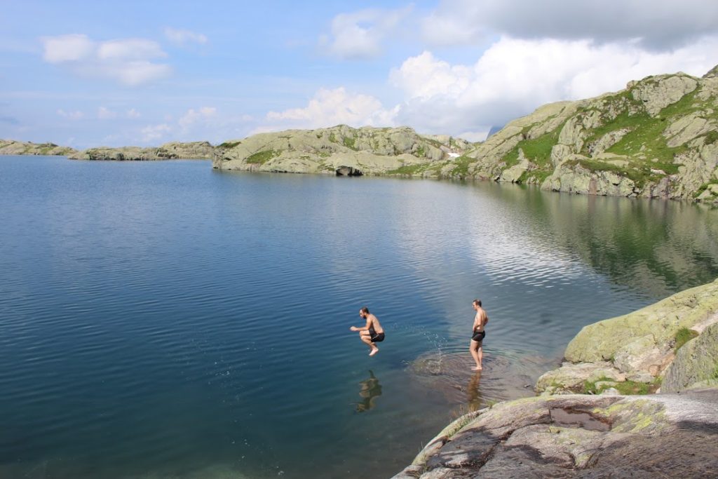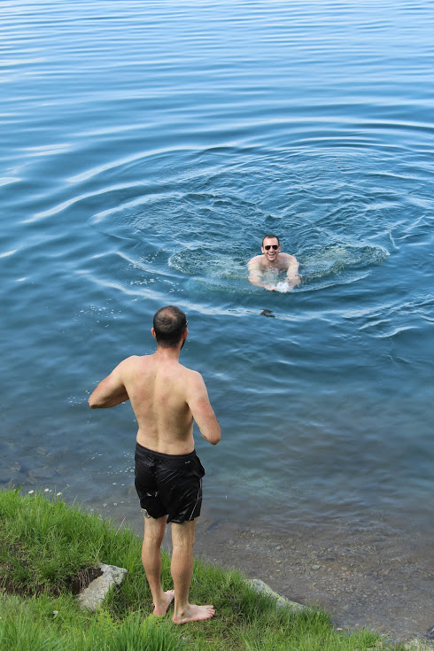 De twee dapperen van de groep (V. en J.B. omwille van de anonimiteit) maken van de gelegenheid gebruik om te zwemmen. Het is geweldig om alleen in een groot bergmeer te zwemmen