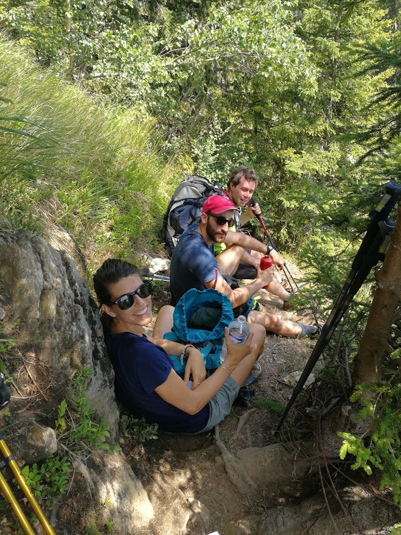 Wij maken ons echter zorgen over de hoeveelheid water die wij verbruiken. Met deze hittegolf nemen we om de 20 à 30 minuten een verfrissende pauze en drinken we 2,5 tot 3 liter per dag en per persoon! Diane is zelfs degene die ons helpt bij de afdaling, we waren allemaal droog. We moeten onze waterreserves beter beheren, want veel meer kunnen we niet op onze rug dragen