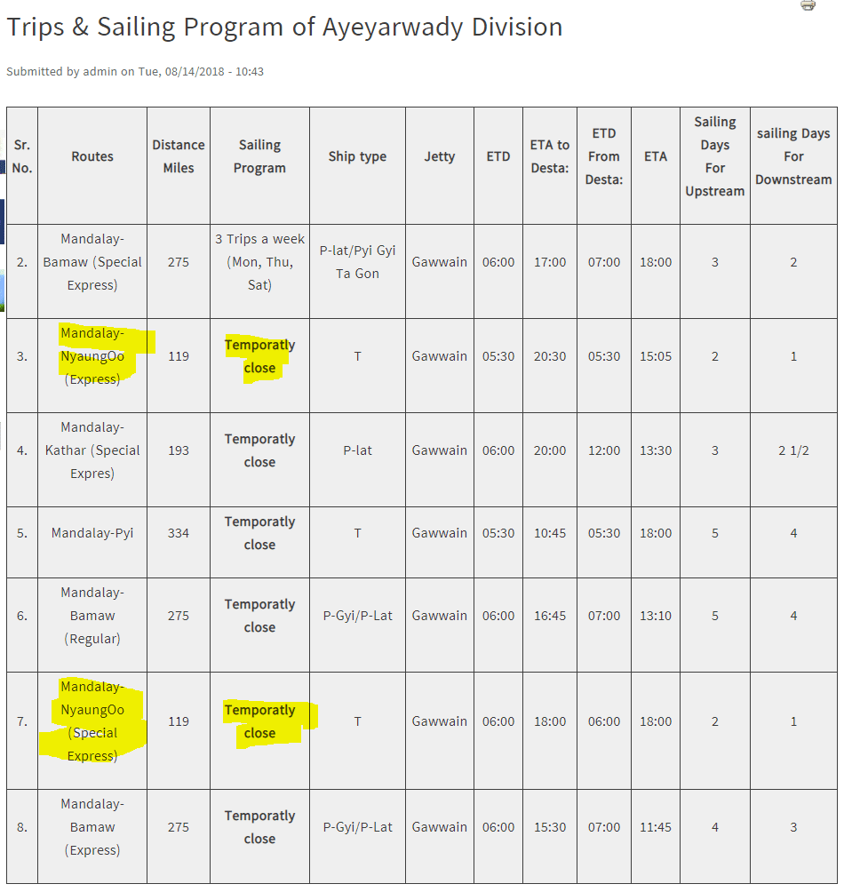 Raadpleeg de bijgewerkte dienstregeling op de officiële website van het IWT. De route waar u in geïnteresseerd bent is Mandalay-Nyaung Oo