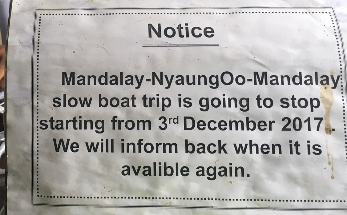 De langzame boot wordt alleen genomen door de plaatselijke bevolking (en de weinige toeristen die van het bestaan ervan afweten). Het kost, vanaf augustus 2016, 18.000 kyats. Hiervoor hebt u recht op een plastic basisstoel. De Birmezen daarentegen zitten op de grond, op bamboe matten die zij zelf hebben meegebracht. Sommige hebben zelfs dekens