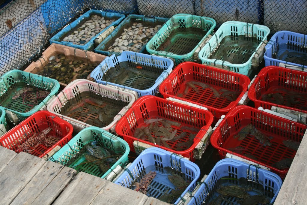 We bezoeken de vissers, die op de drijvende dorpen wonen. Ze vissen niet echt meer, het is meer kweken