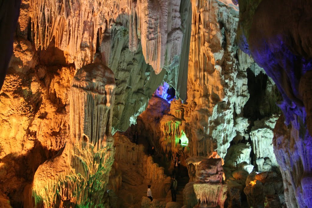 De boot legt aan en we bezoeken de verrassingsgrot. De naam is slecht vertaald, Hang Sung Sot zou eerder vertaald moeten worden met de grot “Mond open” zo mooi. Het is de meest bezochte grot in Ha Long Bay. Toen ik er in 1993 heen ging, was het nog niet verlicht. Ik weet dat veel toeristen kritiek hebben op de ontwikkelingen die zijn doorgevoerd, en op de verlichting die er een beetje kitsch uitziet, maar ik moet u verzekeren dat toen ik het onverlicht bezocht, ik eerlijk gezegd geenszins in een “gaapmodus” verkeerde omdat ik niets kon zien, en ik elk moment het risico liep in een gat te vallen en dood te gaan. Het is dus een zeer goede zaak, om zijn ware schoonheid te zien, dat de lichten werden geïnstalleerd. Ik heb wel kritiek op de keuze van het licht (geen rood/blauw licht nodig, normaal licht zou voldoende zijn geweest)