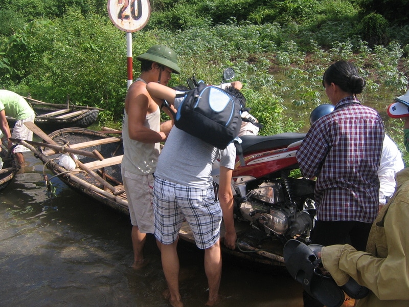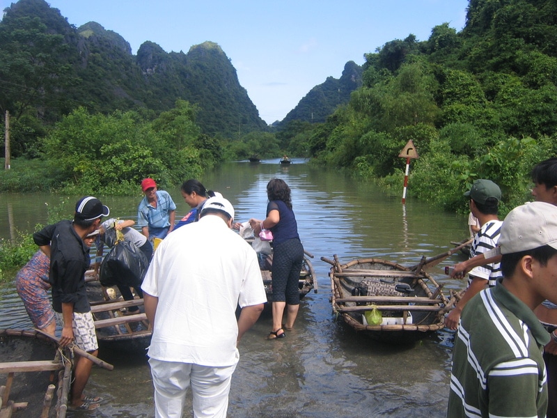 Maar je moet vertrouwen op de vindingrijkheid van de Vietnamezen en hun zakelijk inzicht. Verschillende plaatselijke bewoners hebben het probleem ontdekt en ze komen, uit het niets, met hun bamboe boot, klaar om toeristen, bagage en motor te vervoeren. Dit is een extra kost voor ons agentschap, maar zij rekenen het ons niet aan. Onze gids belt zijn agentschap om het extra budget te valideren, terwijl wij genieten van deze geïmproviseerde rit, blij om het in het bos te doen 😀