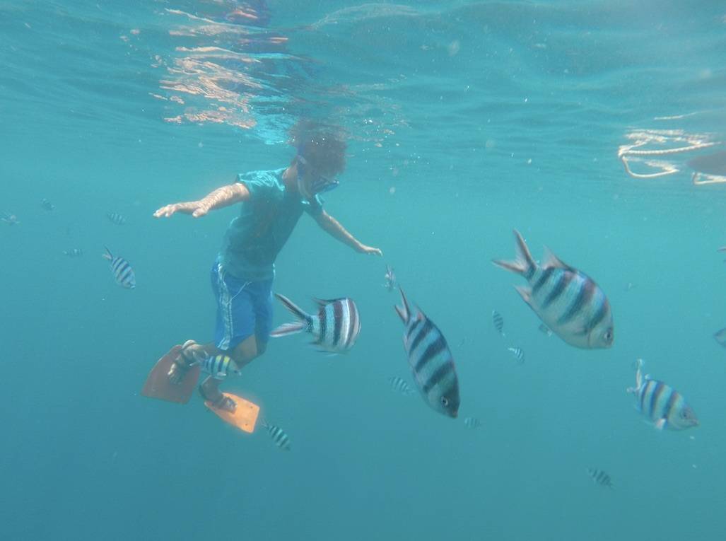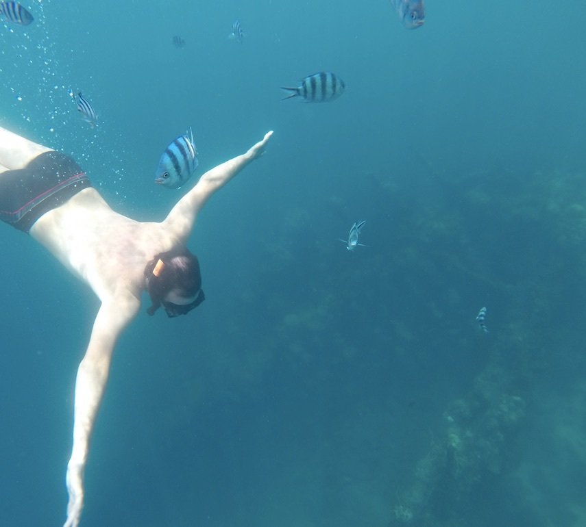 Daarna bezoeken we het Skeleton Wreck, waar veel vis zit (gestreept), ze zijn erg gezellig en zwemmen om ons heen. Ze zijn erg nieuwsgierig en ontrouw: zodra er een nieuwe boot aankomt, laten ze ons gaan om rond de andere boot en andere toeristen te zwemmen. We kunnen de boot nog steeds vrij goed zien tijdens het snorkelen, ook al is het ondiepste gedeelte op 5 meter. Hier is JB aan het snorkelen met zijn visvrienden
