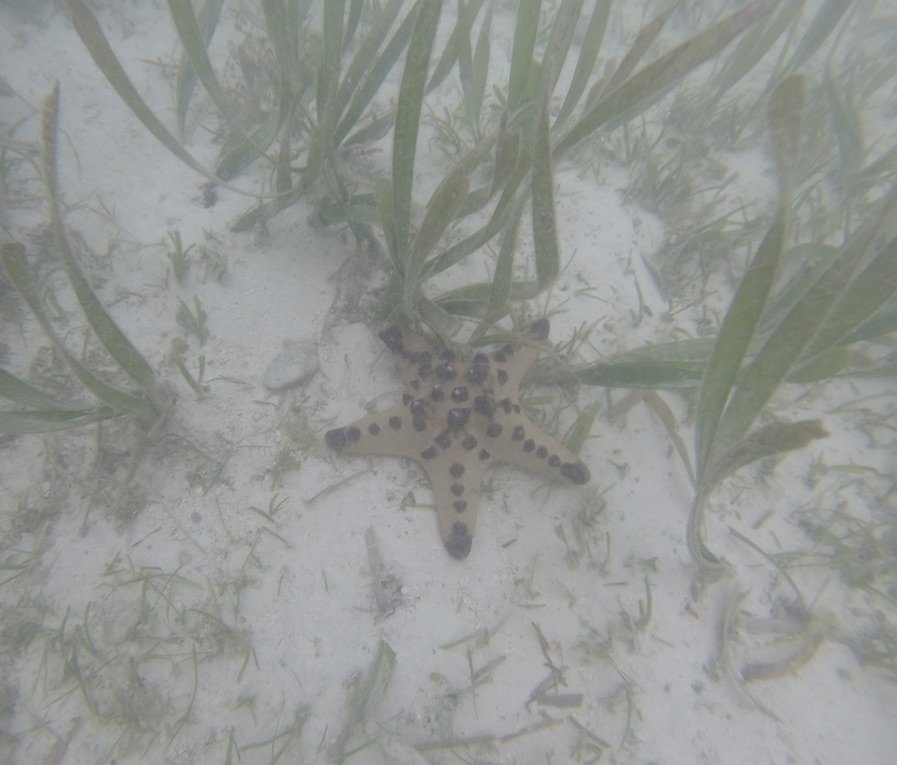 Wat zien we in het water? Een enorme zeester. Ondanks het verbod om vissen/koralen en dergelijke aan te raken, trokken de Chinese toeristen op onze boot deze zeester uit het water om er selfies mee te nemen. OMG!