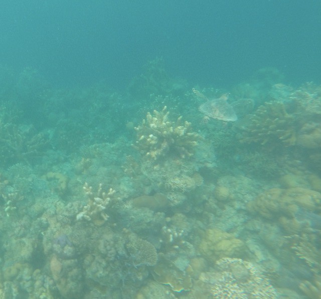 We snorkelen 2 minuten met de boot vanaf daar, bij de Reef Garden, en zien een grote schildpad (zie foto hieronder, rechtsboven). We volgen het een paar minuten, tot het te laag komt en onzichtbaar wordt. Het is magisch! De koralen zijn erg mooi en behouden mooie kleuren in tegenstelling tot in El Nido