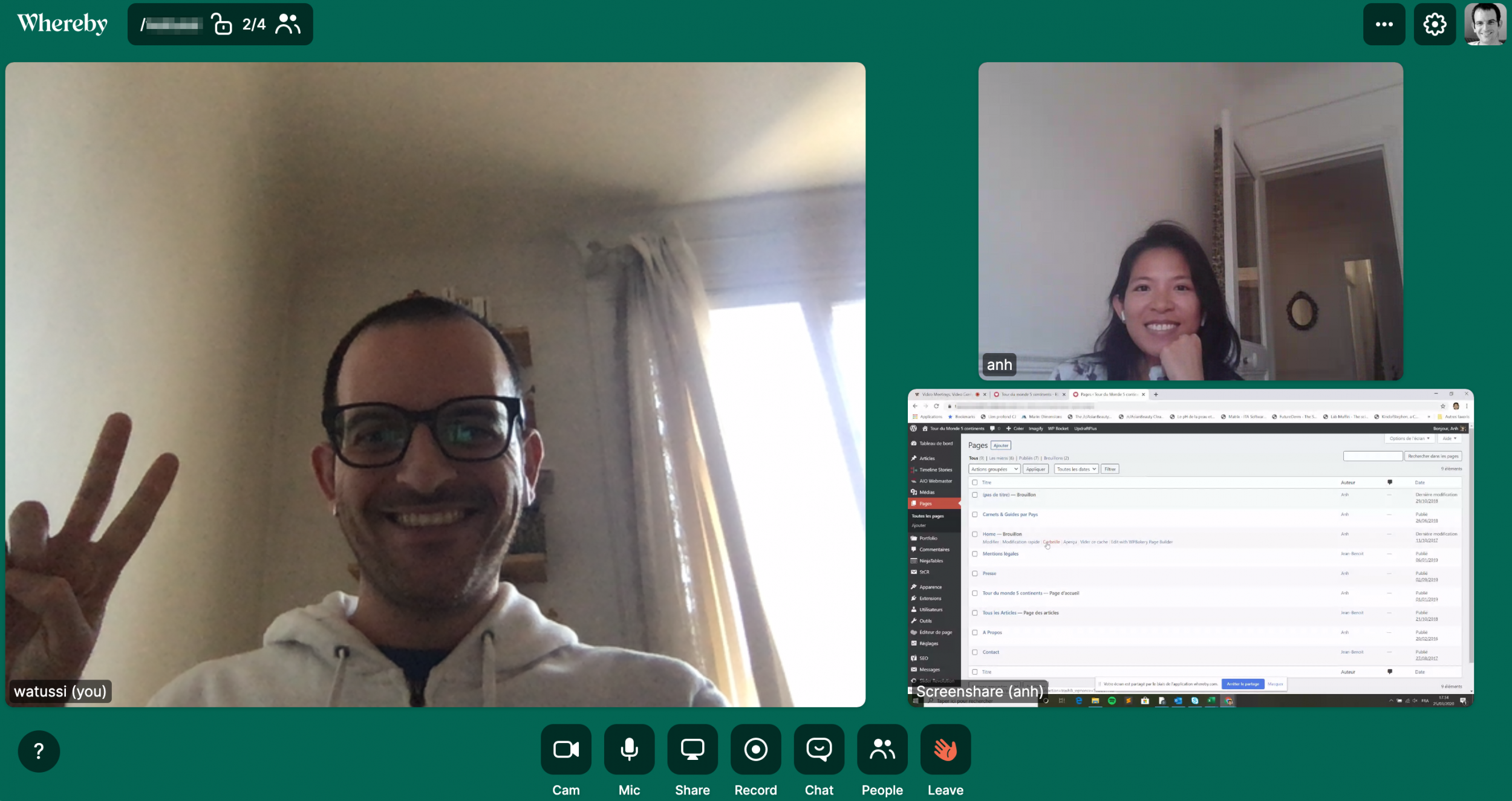 Ik hou van Whereby en zijn gebruiksgemak, maar ik gebruik het niet veel omdat ik vaak in landen ben met trage internetverbindingen en Whereby een hoge bandbreedte nodig heeft. Als uw verbinding goed genoeg is (Whereby beveelt 3,2 mb/s up en down aan), kan ik het gebruik ervan ten zeerste aanbevelen, het is een geweldige oplossing.