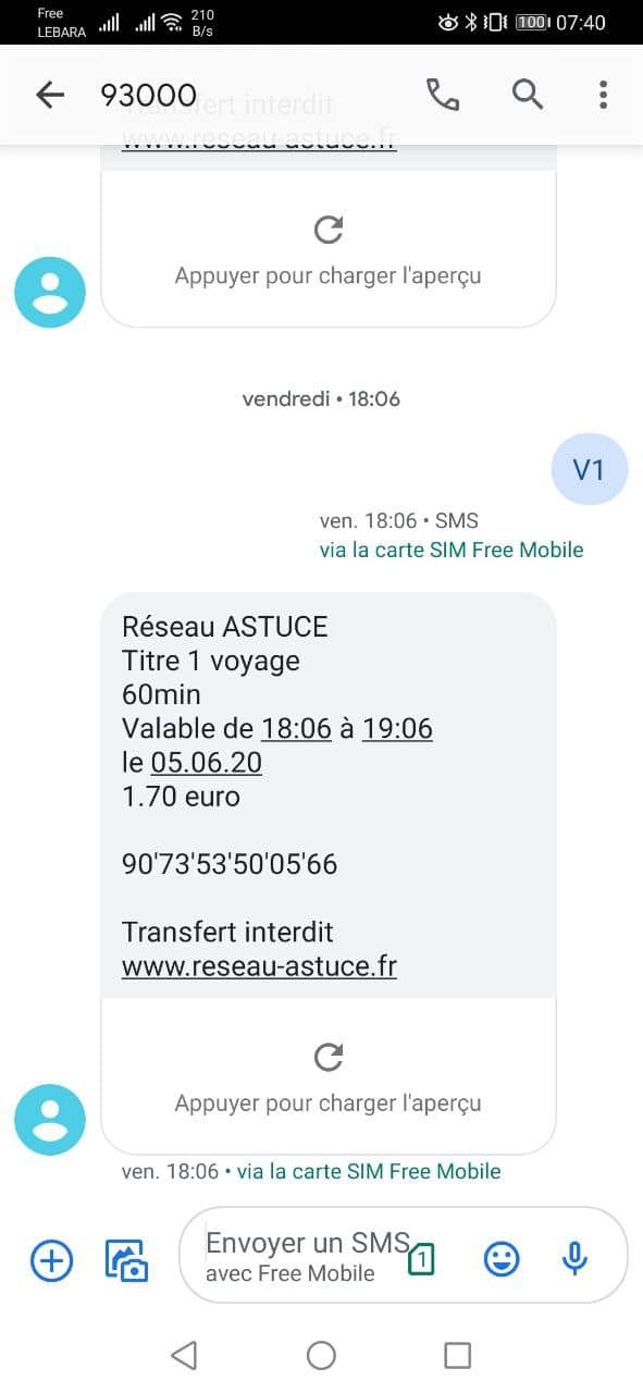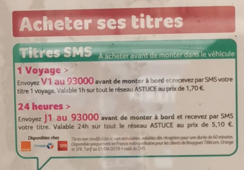 - Stuur J1 naar 93000 voor een ticket dat 24 uur geldig is en 5,10 euro kost