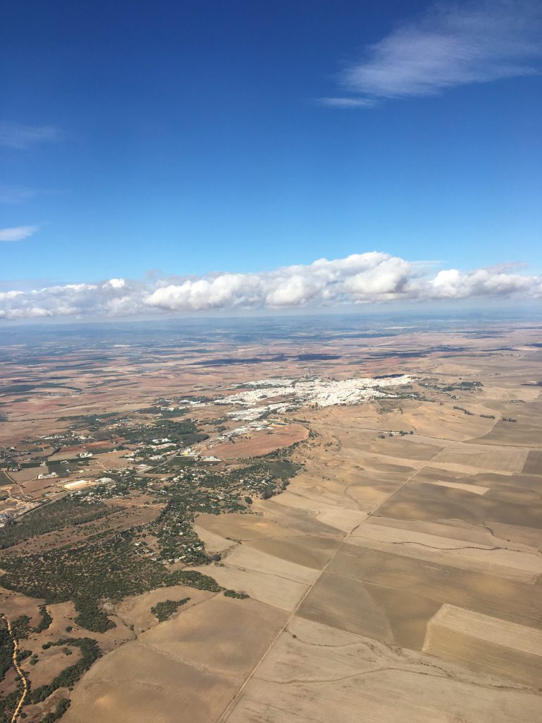 Vanuit het vliegtuig kan ik een mooi wit stadje zien, ik denk dat het Alcalá de Guadaíra is