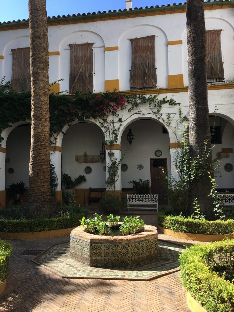 We begonnen ons bezoek aan de stad bij het Palacio Marqueses de la Algaba (gratis toegang), waarvan de architectuur die van het koninklijk paleis imiteert; met zijn kleine tuin, de fontein in het midden, en zeer indrukwekkende plafonds