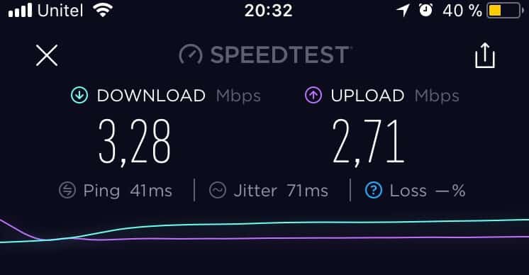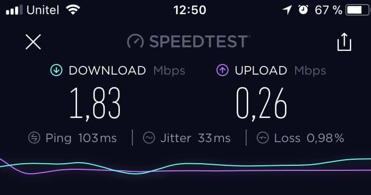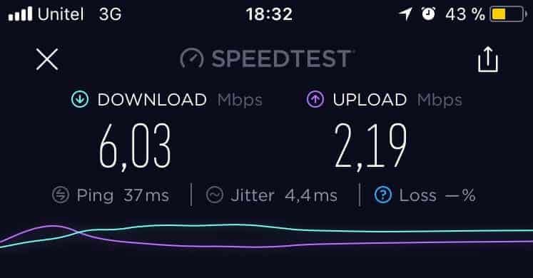 Ik kocht een SIM-kaart van Unitel (zie mijn artikel over hoe en waar te kopen hier), het beste telefoonnetwerk van het land (dankzij een partnerschap met Vietnamese telecomnetwerken). Ik heb een snelheidstest gedaan en hier zijn de resultaten